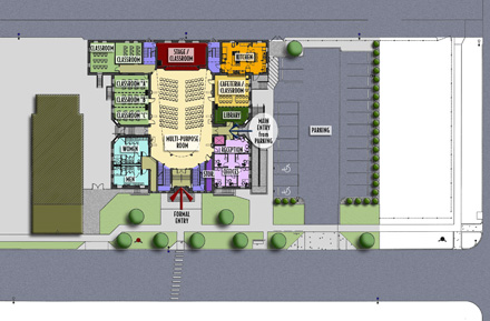 The renovation of the existing 31,000 square foot facility provides much needed space for ministerial and educational services including classrooms, multipurpose rooms, and a library and cafeteria with conference room functions. Upgrades to the facility include total replacement of all building systems (HVAC, plumbing, and electrical), the installation of a new commercial kitchen, new toilet and shower facilities, additional office space for the Hispanic Institute, ADA access ramps and railings, and complete parking and landscaping upgrades. Planning for the project had to incorporate provisions for subsequent phases of the renovation, including the installation of an elevator shaft, and accommodations for providing updated HVAC and electrical services to the second floor. In addition to these technical concerns, the design and renovation processes were carefully crafted to facilitate the multiple functions required of the facility, and to provide modern services and amenities in a building that dates to the 1890’s, while maintaining the character of both building and neighborhood.