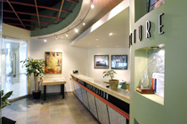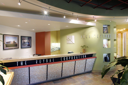 The relocation of the Roybal Corporation office presented us with an excellent opportunity to develop a facility that would accurately reflect the principals and personnel of the firm. High ceilings and floor to ceiling curtain walls offer an impressive volume in a limited space, producing a light and comfortable work environment.