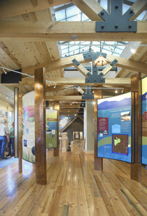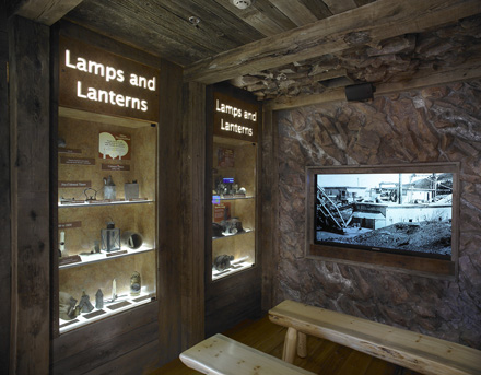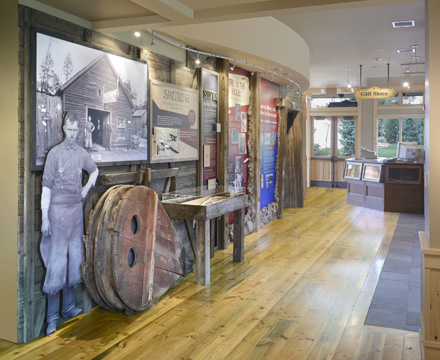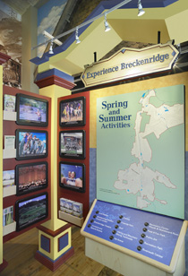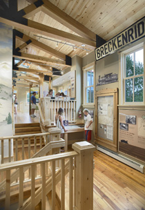 One of the features of this exhibit was to incorporate the existing cabin so it would reflect the town’s historic character and provide an anchor to this, the center of the city. The cabin became the historical centerpiece for the Welcome Center and features exhibits about the booms and busts of Breckenridge, as well as audio with some of the town’s more colorful characters.
